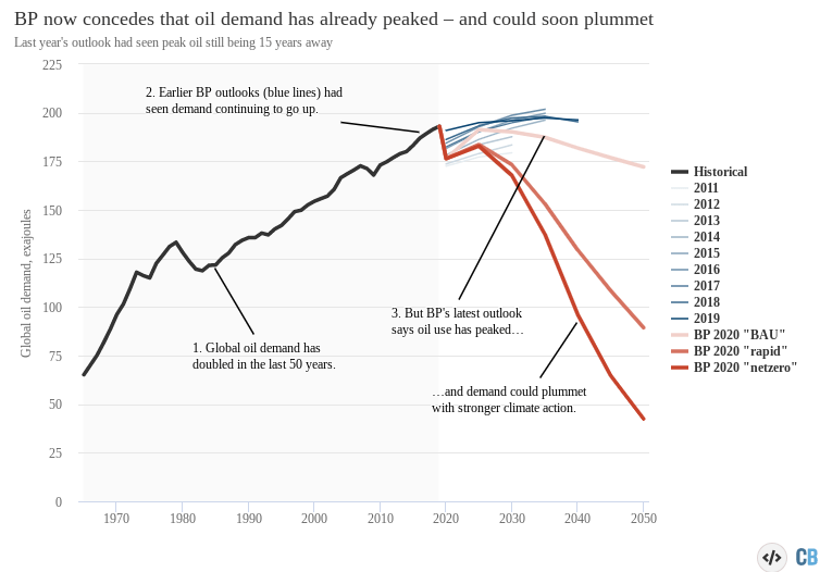 It is possible that we’re past peak oil. Predicting the future is a necessary yet futile part of civilization. The current projections reflect a possible significant change. Previous predictions expected oil demand to continue to increase forever, which is more of an extrapolation of habits than an assessment of reality because the planet has limits. Thanks to the increased use of renewable energy, lifestyles that are shifting from the real to the virtual world, and a general awareness of climate change, the demand for oil and other fossil fuels is expected to remain near last year’s levels, or decrease. Under some scenarios, our current oil consumption of about 192 exajoules could drop by ~50% by 2040 while renewables increase to providing 296 exajoules. Other fossil fuels are also expected to follow the trend. As mentioned before, an increase in renewable’s technology and adoption can decrease their prices, which can reduce the demand and supplier base for the relatively technologically-stagnant fossil fuels thereby increasing their per-consumer cost.