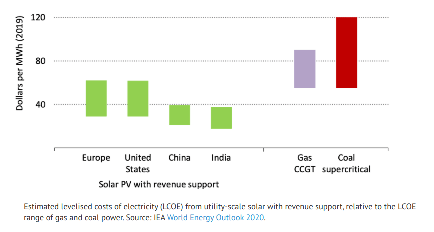 Solar power has been generating enthusiasm from homeowners, partly from cost savings, the ability to sell excess to the grid, and the ability to mitigate power outages. Utilities now have a greater incentive to go solar, too. Power plants are expensive. Coal and gas power plants cost about $60-$120/MWh (MegaWatt-hour). Solar plants only cost $20-$60/MWh. Existing plants include sunk costs, so existing plants of either type are likely to continue until they become too uneconomical to operate; but in regions with enough sunshine, solar becomes cheaper. In isolated places like islands or mountainous terrain, solar can also be preferred because fossil fuels are vulnerable to delivery interruptions. The adoption of utility-sized renewable power plants is expected to improve your chances of mitigating climate change. Cost spirals can affect both approaches. Renewable energy technologies continue to develop, driving down costs and increasing adoption. A decreasing customer base spreads fossil fuel costs across fewer customers raising their prices, potentially encouraging more customers to switch to cheaper options, which repeats the spiral. Progress, slow; but progress.