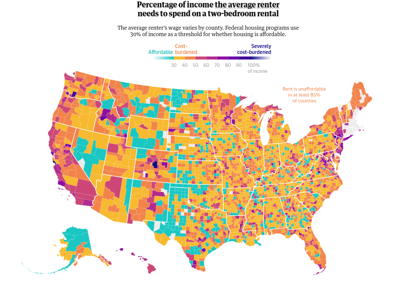 “…a worker now needs to earn about $20.40 an hour to afford a modest one-bedroom rental. The median wage in the US is about $21 an hour.” – The Guardian