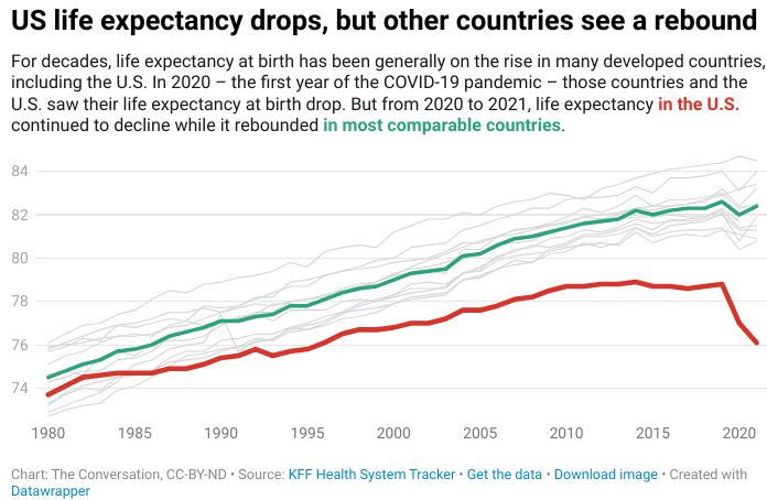 “In 2021, more than 892,000 of the 3,456,000 deaths the U.S. experienced, or about 1 in 4, were “excess deaths.” In 2019, that number was 483,000 deaths, or nearly 1 in 6. That represents an 84.9% increase in excess deaths in the U.S. between 2019 and 2021.”